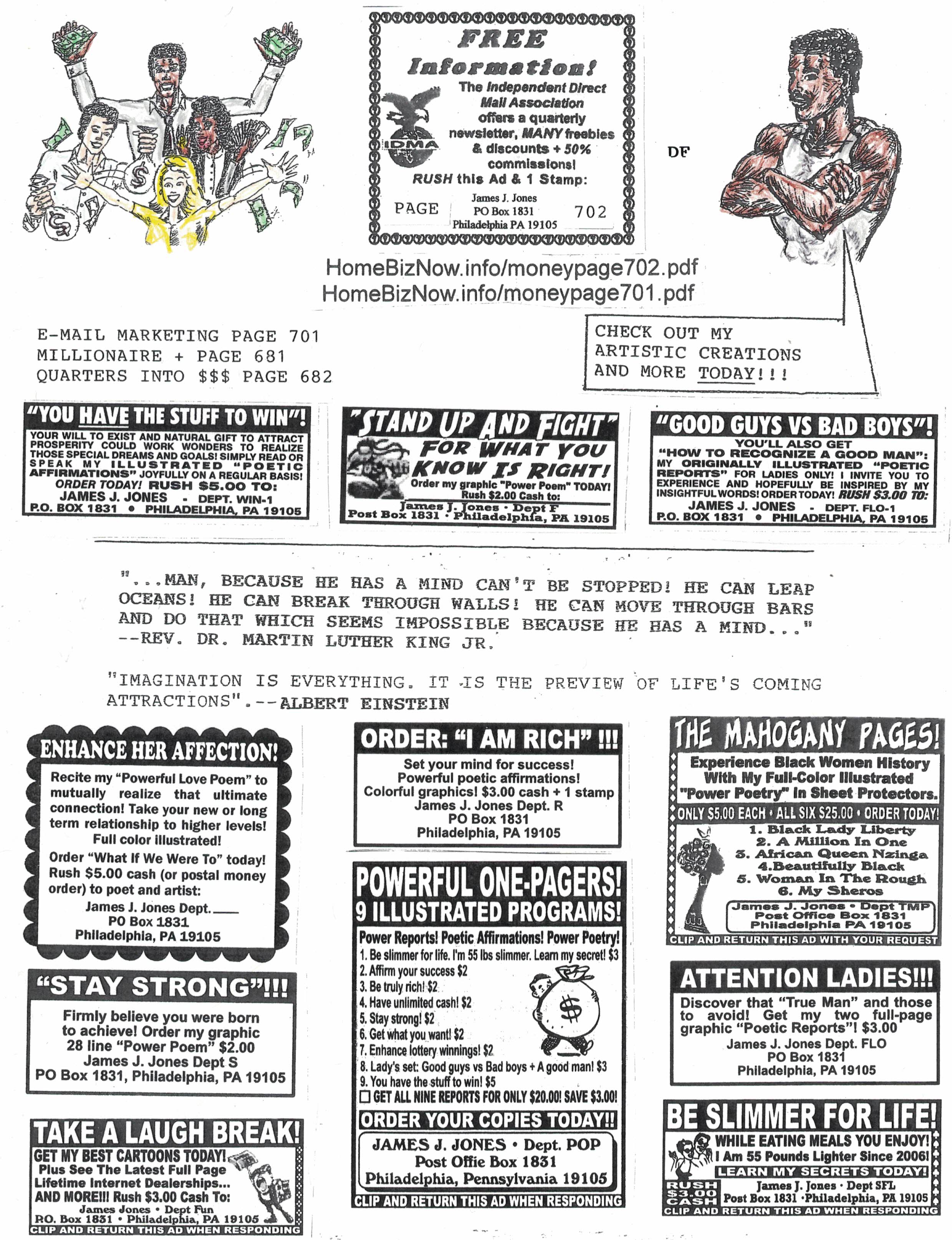 Why wait weeks or months to have your ads in circulation? Your 1" to 3" ads in 50 different ad sheets. 1,000,000 circulation only $60.00 + 6 F/C stamps to: Richard Lanier, 306 East 171 Street Apt. 2-F, Bronx NY 10457. Send cash or money order only.