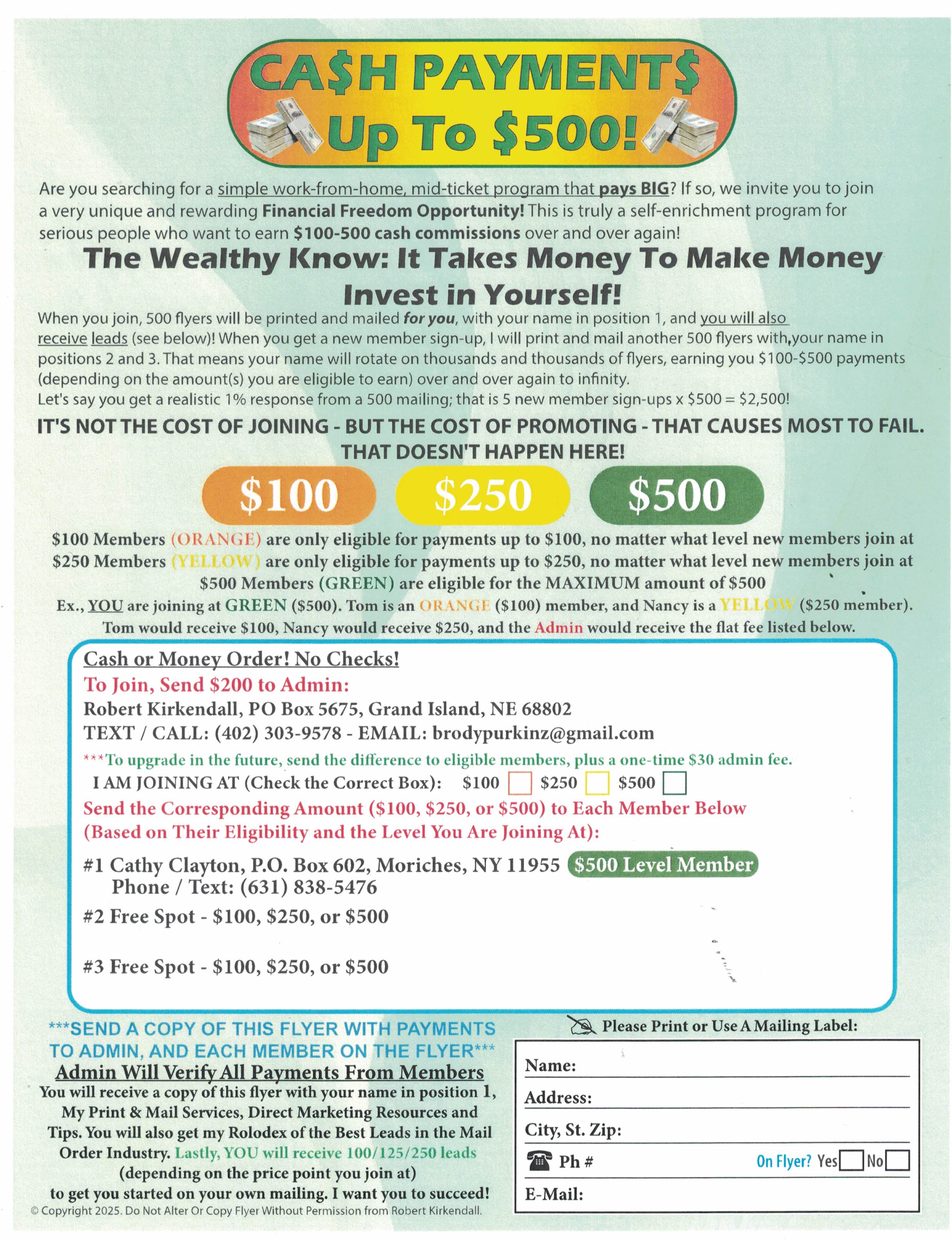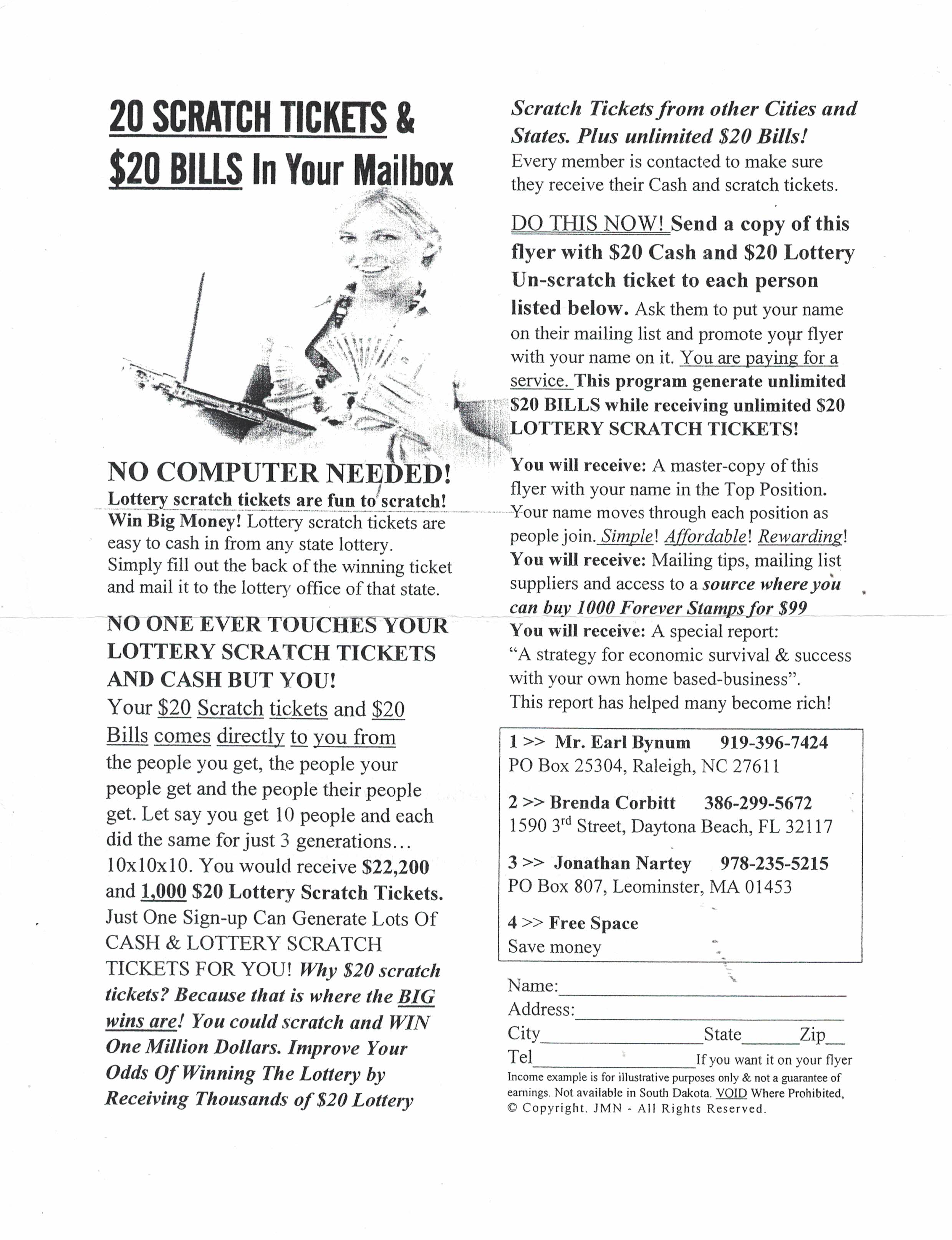 Never be broke again. Join these 20 millionaire programs. Cash will flood your mailbox. Mail $5 + 5 stamps to: Millionaire, PO Box 3084, Memphis TN 38173