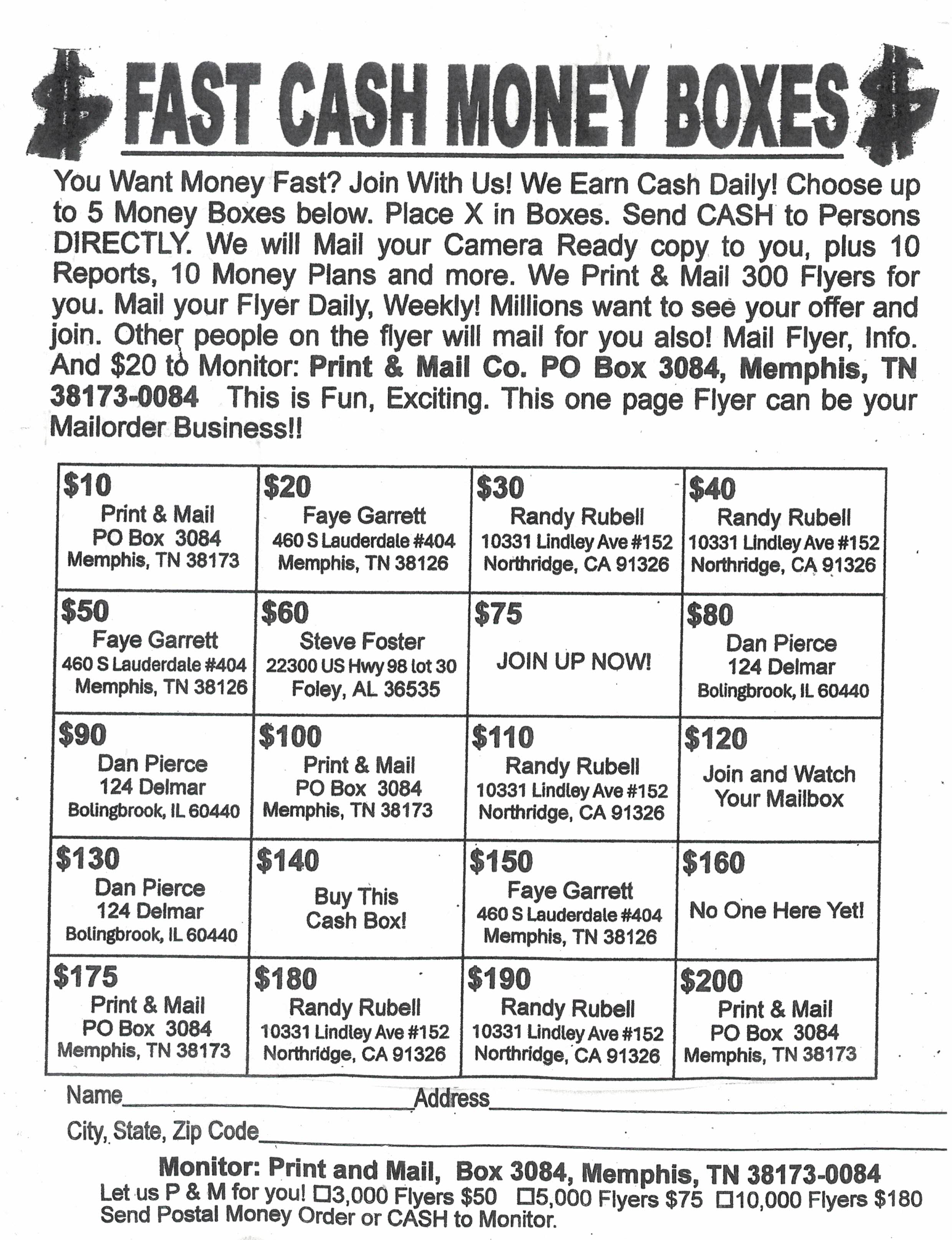 Never be broke again. Join these 20 millionaire programs. Cash will flood your mailbox. Mail $5 + 5 stamps to: Millionaire, PO Box 3084, Memphis TN 38173
