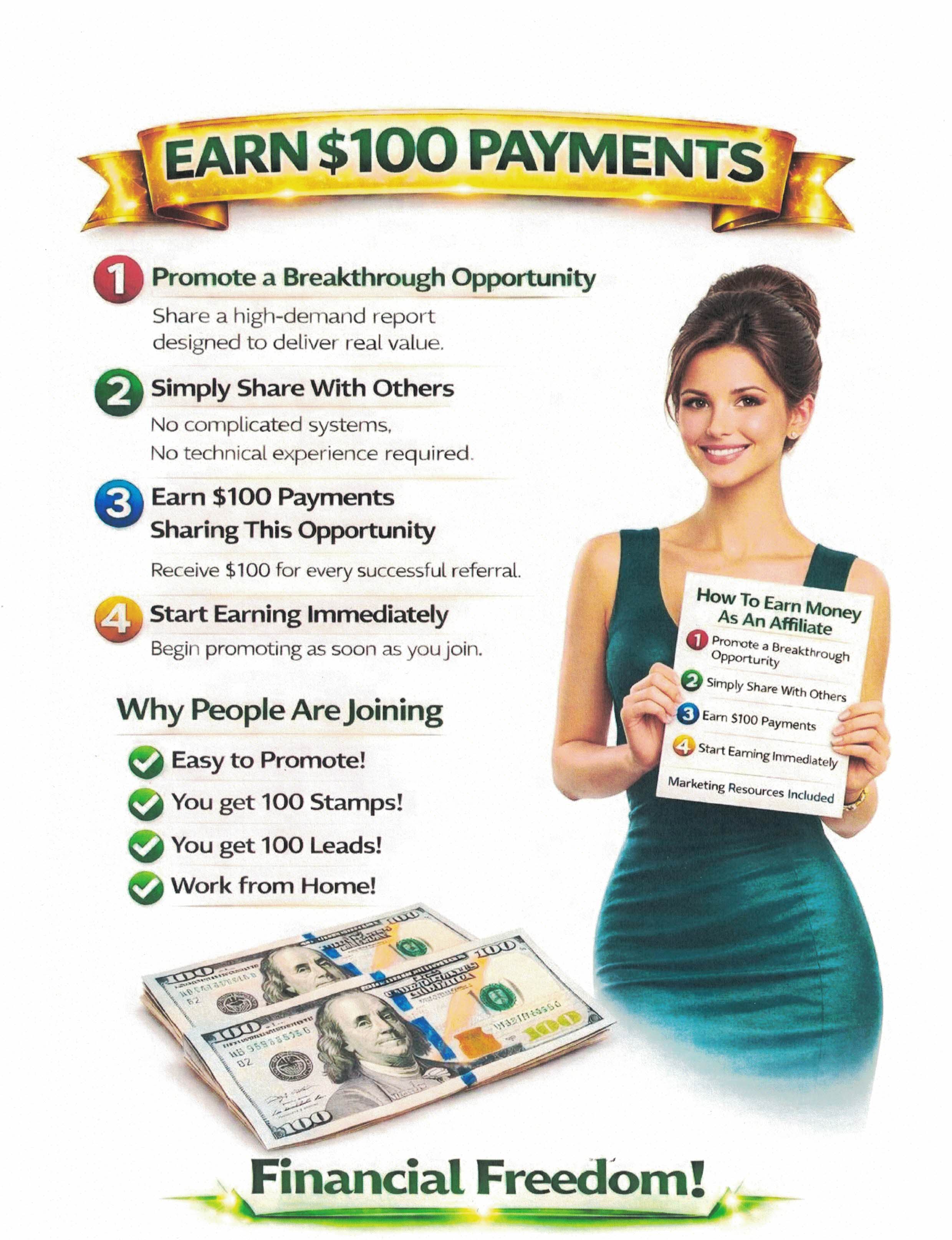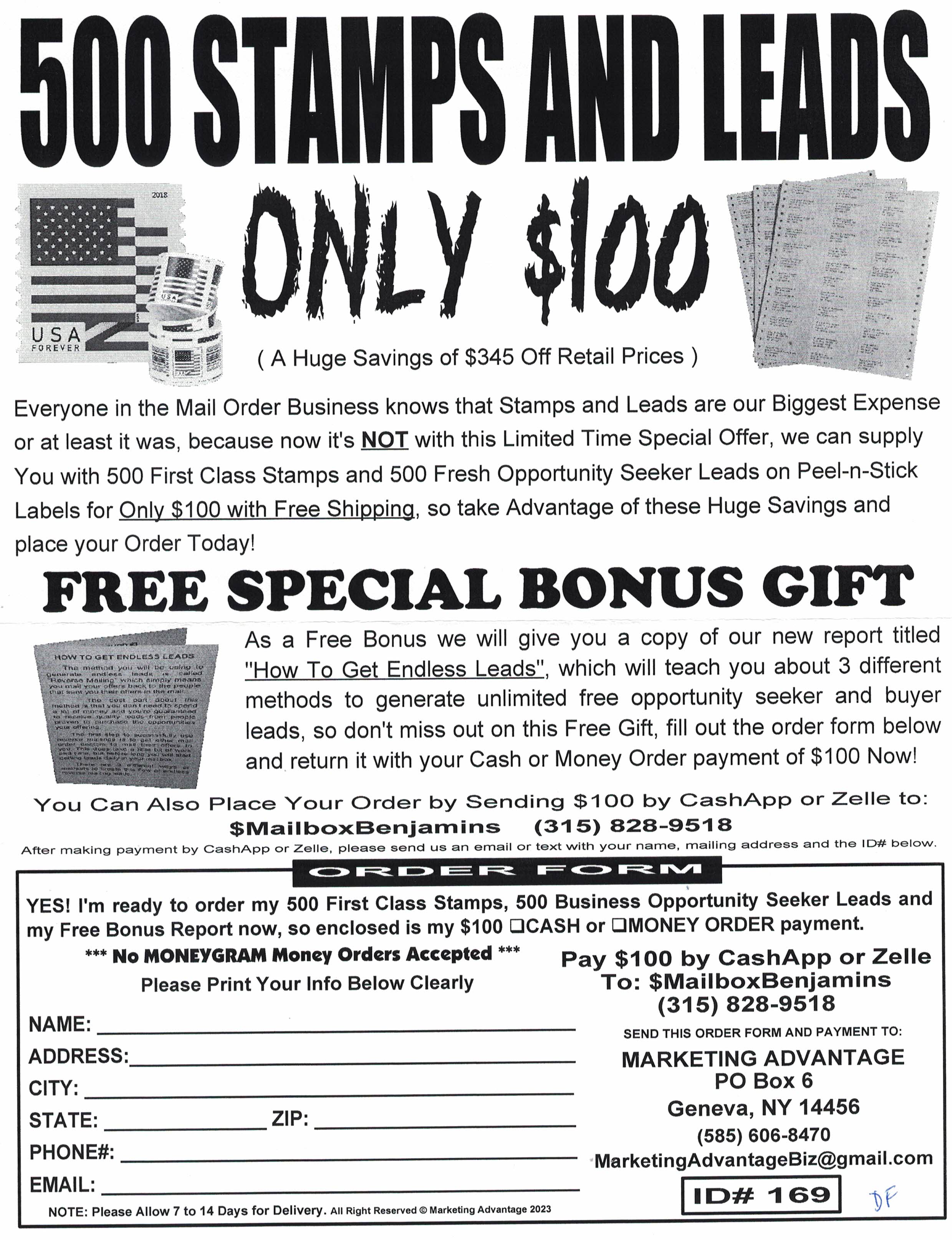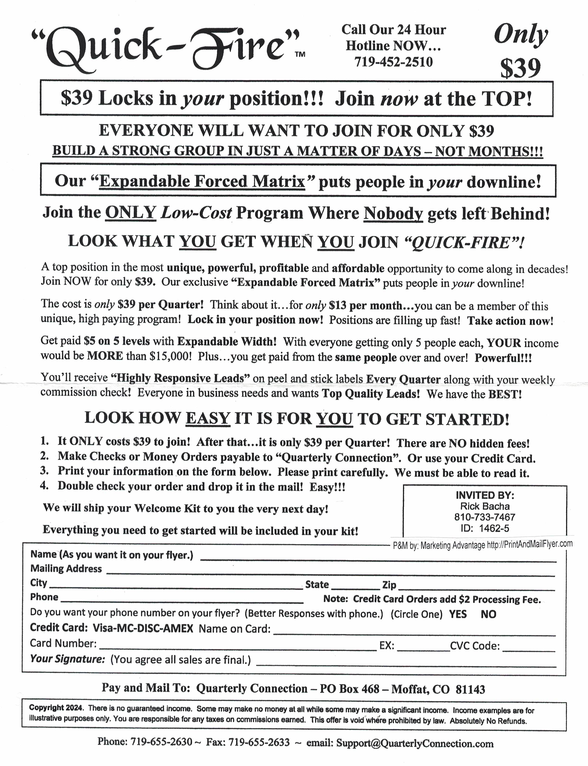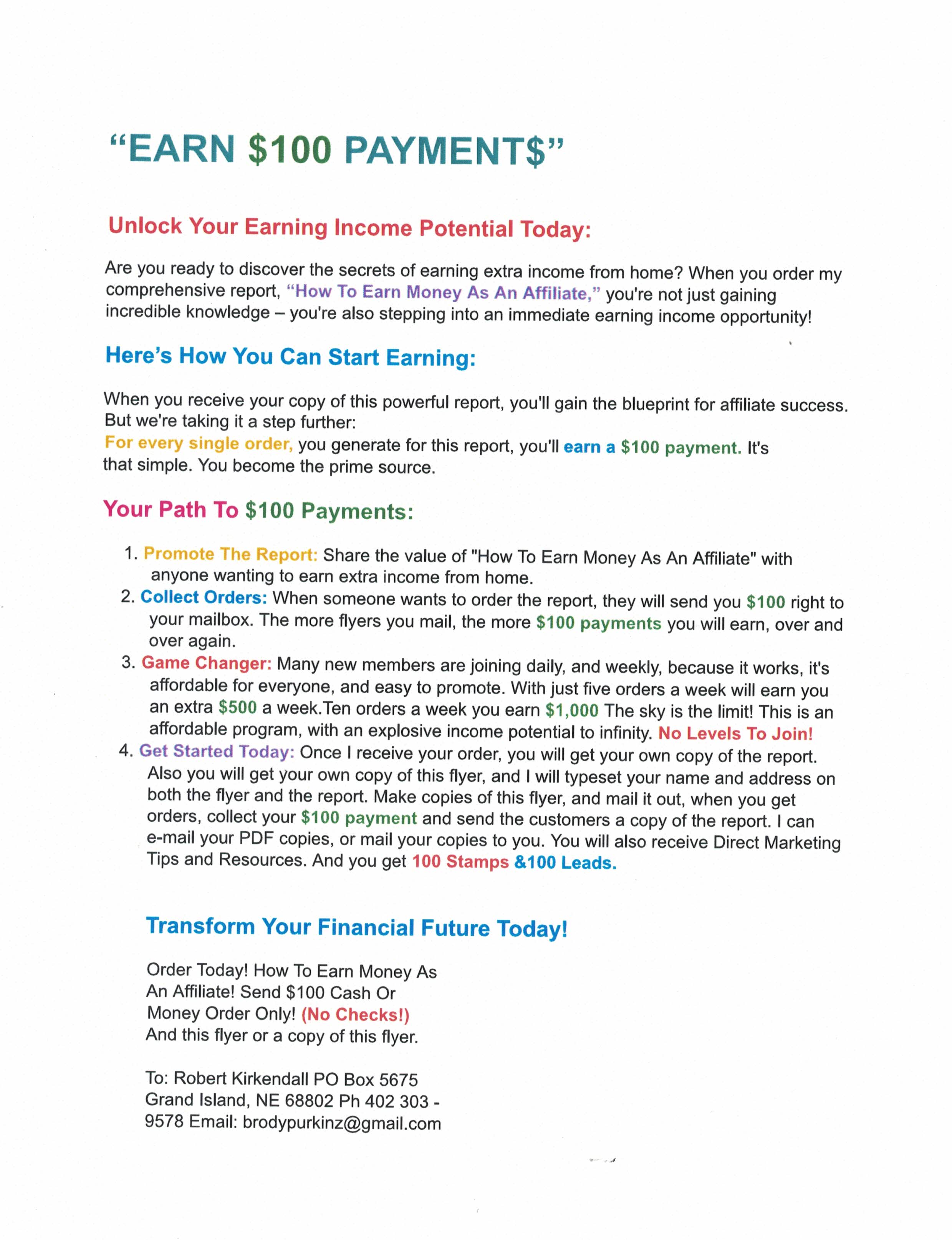 Join this great program that pays a whopping $50 on all people you recruit. Guarantees residual income and play the lotto too! One f/c stamp! Bill Maurer, 2801 Toledo Rd. Apt. 515, Elkhart IN 46516